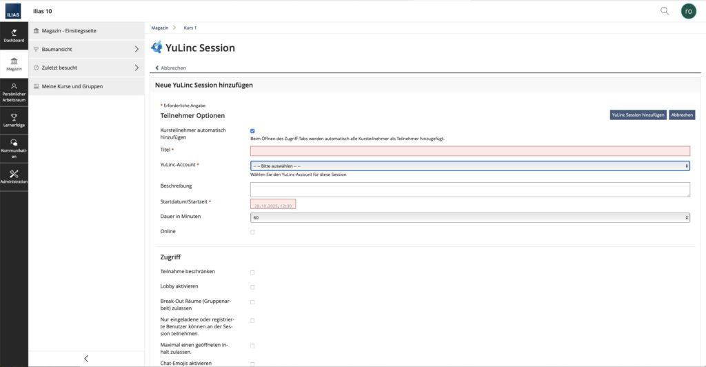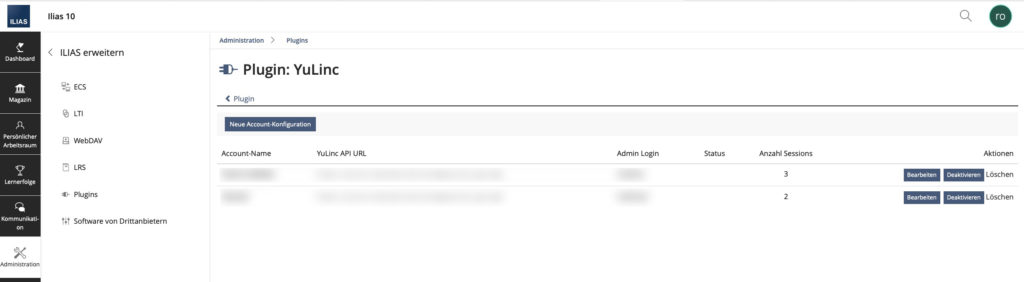 In dieser Version 3.1.0 von YuLinc gibt es einige spannende Neuerungen! Neben dem automatisierten Hinzufügen von Kursteilnehmern oder der Kursadministration/Kursbetreuung aus dem Kurs zur YuLinc Session, je nach Rolle in Ilias als Teilnehmer oder Moderator in der YuLinc Session, könnt ihr jetzt auch mehrere YuLinc Account Konfigurationen anlegen. Das macht die Verwaltung eurer YuLinc Accounts noch flexibler und einfacher!