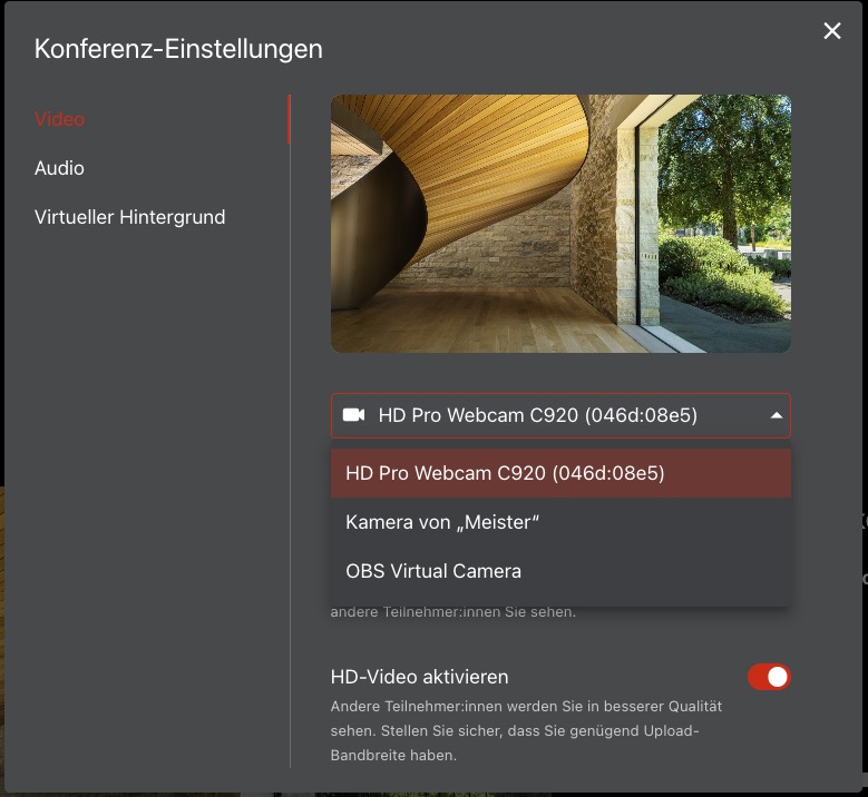 Auswahl und Steuerung des virtuellen Hintergrunds